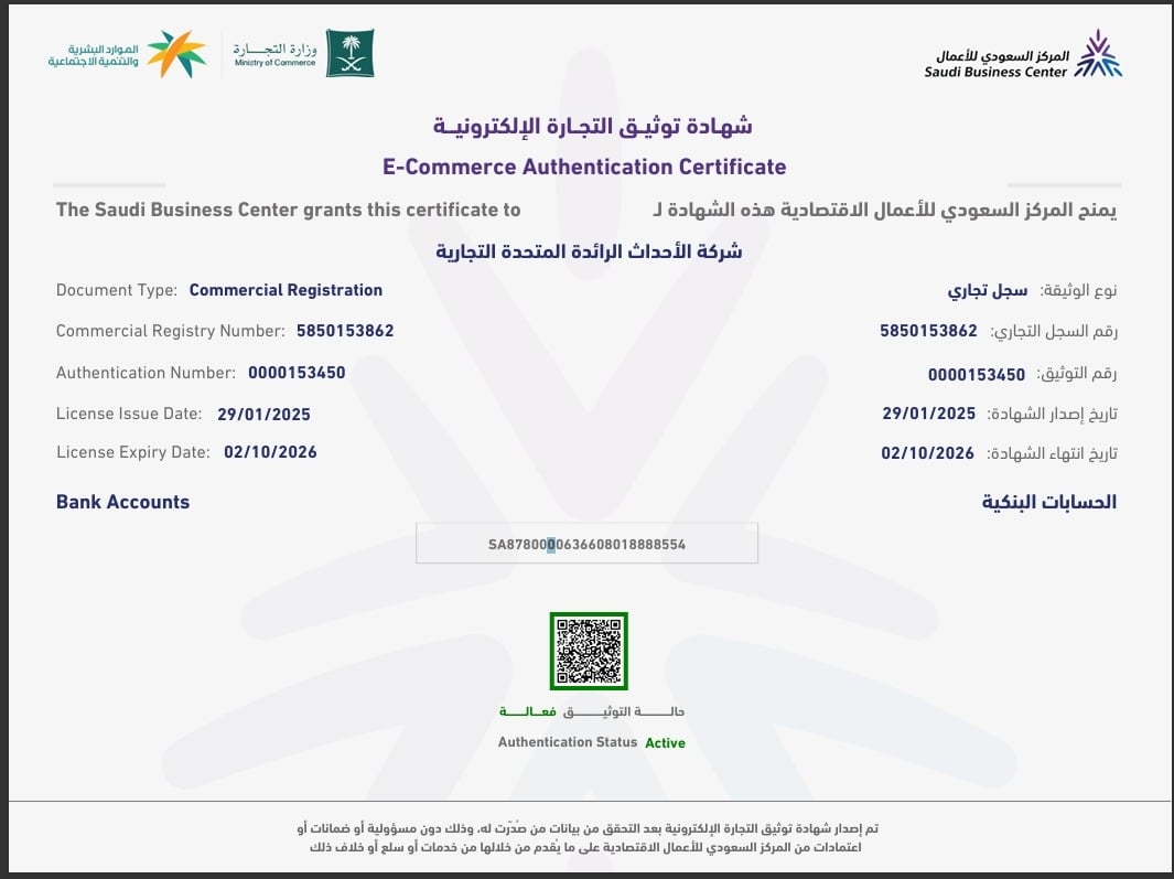 تطمني حقك محفوظ عندنا وهذي هي شهادة توثيق الشركة لدى مركز الأعمال السعودي